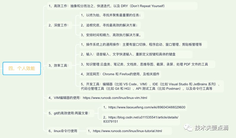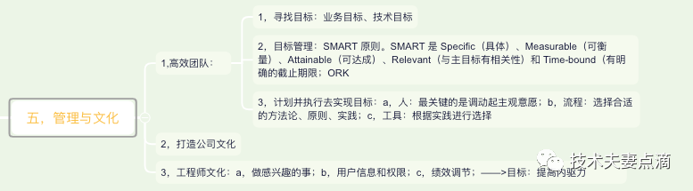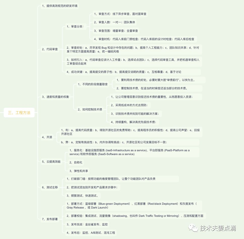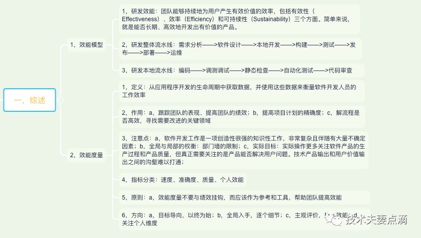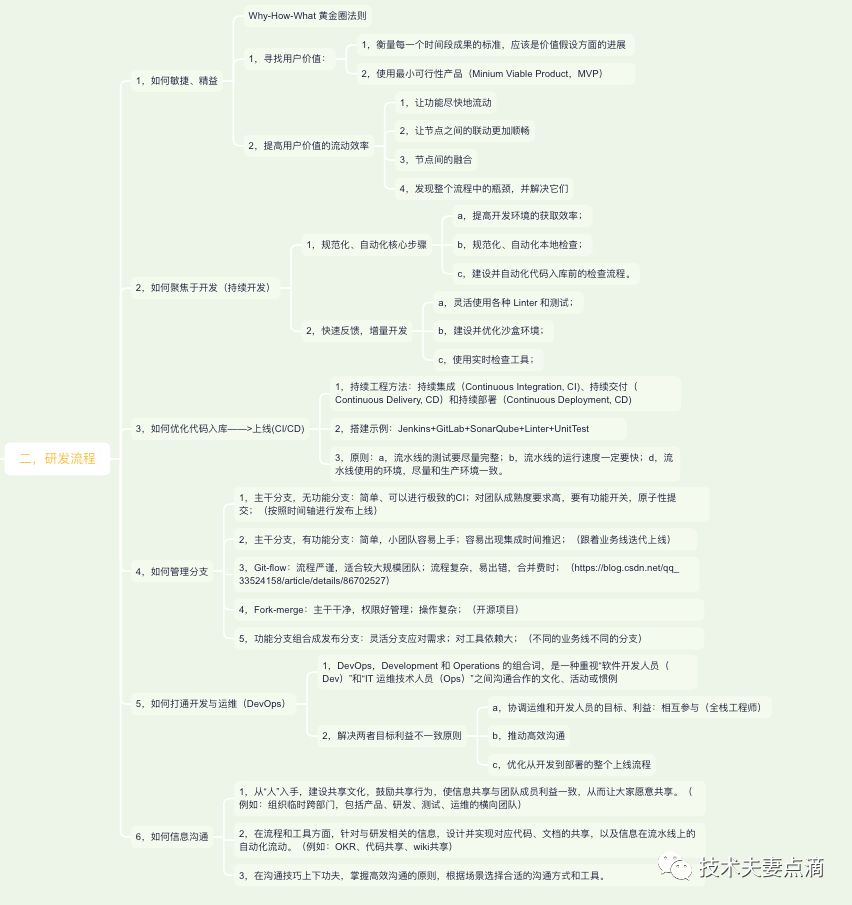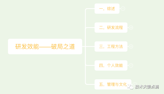 最近学习了葛俊的《研发效率破局之道》,再加上自己的工作经验,感悟挺多的。这里做个研发效能知识网的总结,希望对大家和自己都有一些帮助。这篇文章更多是从知识网的层面进行梳理总结。 我一直认为:知识网需要我们不断的绘织,首先知道要做什么,需要做什么,具体怎么做,需要我们根据实际情况区别对待,选择属于当下最合理的方案。知道做什么了,然后才会去考虑的怎么做,而且怎么做在当今信息发达的社会,是难不住我们的。那句话怎么说"不怕不知道,就怕不知道"。好开始梳理绘织研发效能知识网。 研发效能是什么呢?首先需要我们搞明白。研发效能:团队能够持续地为用户产生有效价值的效率,包括有效性(Effectiveness)、效率(Efficiency)和可持续性(Sustainability)三个方面。简单来说,就是能否长期、高效地开发出有价值的产品。 而,注重研发效能能带来哪些好处呢?开发者能够聚焦产出价值,更容易精进自己的技术。于是,团队容易建立起好的氛围,进而又能促进生产效率的提高,形成良性循环,支撑持续的高效开发。 好,清楚了以上两点,我们从综述、研发流程、工程方法、个人效能、管理与文化几个方面进行梳理。我还是用思维导图进行总结,每个知识点,大家都可以展开好好思考好好学习。  一,综述,既然要想办法提高研发效能,那么我们应该研发的那些方面如思考呢?又如何取度量效果呢?  二,研发流程,在公司中,尤其是规模化研发公司,如何提高研发流程效能至关重要,包括方方面面的规范化,看下边的梳理:  三,工程方法,在研发管理中,如何权衡一些实施方案,如何让一些方案帮助团队提高研发效能呢?(大家看看,应该公司基本上或多或少的都会用到一些)  四,个人效能,当然组成团队的个体还是个人,所以个人研发效能的提高,还是重中之重,只有每个人都做好了,整个团队才会更好。这方面我觉得时间管理、个人管理、善于站在巨人肩膀上是重要的。当然每个人具体又有自己独特的方法:  五,管理与文化,管理自己看过很多资料,但是文化方面,自己一直理解不是太深,一直觉得是很缥缈的东西,但是随着最近工作的思考,和最近对“使命、愿景、价值观”的思考。意识到这些所谓“虚”的东西对个人自驱力、挑战力,团队凝聚力、战斗力……起着至关重要的作用。这方面还需要学习深入思考。好,简单梳理了一下:  做好一件事容易,在做好一件事的同时,又能高效的、准确的、持续的不断去做好每一件事,却不是容易的。研发效能如何提高,这里已经帮大家梳理了知识点,我们在平时工作中,有意识的去考虑这些东西,遇到一个点,就去研究,并找出适合自己的在这个点上高效的具体的做法,慢慢使之形成自己的做事习惯,我相信会越来越优秀,会有你意想不到的收获的。加油! 思维导图下载地址:https://download.csdn.net/download/liujiahan629629/12009293 或扫码二维码和我要,谢谢!  ———————————————— 版权声明:本文为CSDN博主「~小龙~」的原创文章,遵循CC 4.0 BY-SA版权协议,转载请附上原文出处链接及本声明。 原文链接:https://blog.csdn.net/liujiahan629629/article/details/103340049