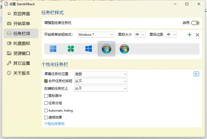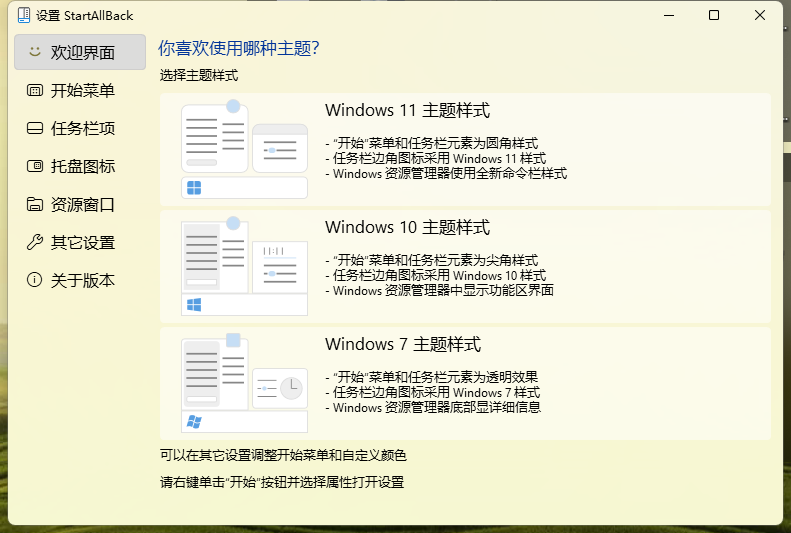 推荐一个软件 StartAllBack,可以把win11的开始菜单和任务栏一键回到win10或win7 之前使用windows一直有一个习惯,就是把 任务栏加高,设置两层,但是在win11上 没有解锁任务栏的功能,好在使用 StartAllBack可以轻松解决这个问题。。 安装完成后可以通过在任务栏 右击->属性,唤出配置界面。  在欢迎界面里可以 随意进行切换。  我换成了win7的开始菜单很经典啊。。主要是双任务栏又回来了。  下载地址: [【附件】startallback_86658.zip](/media/attachment/2024/11/startallback_86658.zip) 类似的软件还有:ExplorerPatcher https://github.com/valinet/ExplorerPatcher