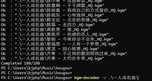 参考:https://github.com/ghtz08/kugou-kgm-decoder?tab=readme-ov-file 在右侧下载最新的发布包: `kgm-decoder.exe` 保存到电脑上之后,可以配置到 windows里的PATH中。 使用方式: * 针对单个文件 ~~~ kgm-decoder <文件名> ~~~ * 针对某个目录下的文件(不包括子目录) ~~~ kgm-decoder <目录名> ~~~ * 针对某个目录下的文件(包括子目录) ~~~ kgm-decoder -r <目录名> ~~~ 试了一下,在powershell中执行很好用。  当然如果不想麻烦,也可以使用在线的转换解密网站: https://www.zhuanhuanyun.cn/convert/KgmToMp3.html?to=.zh-warp