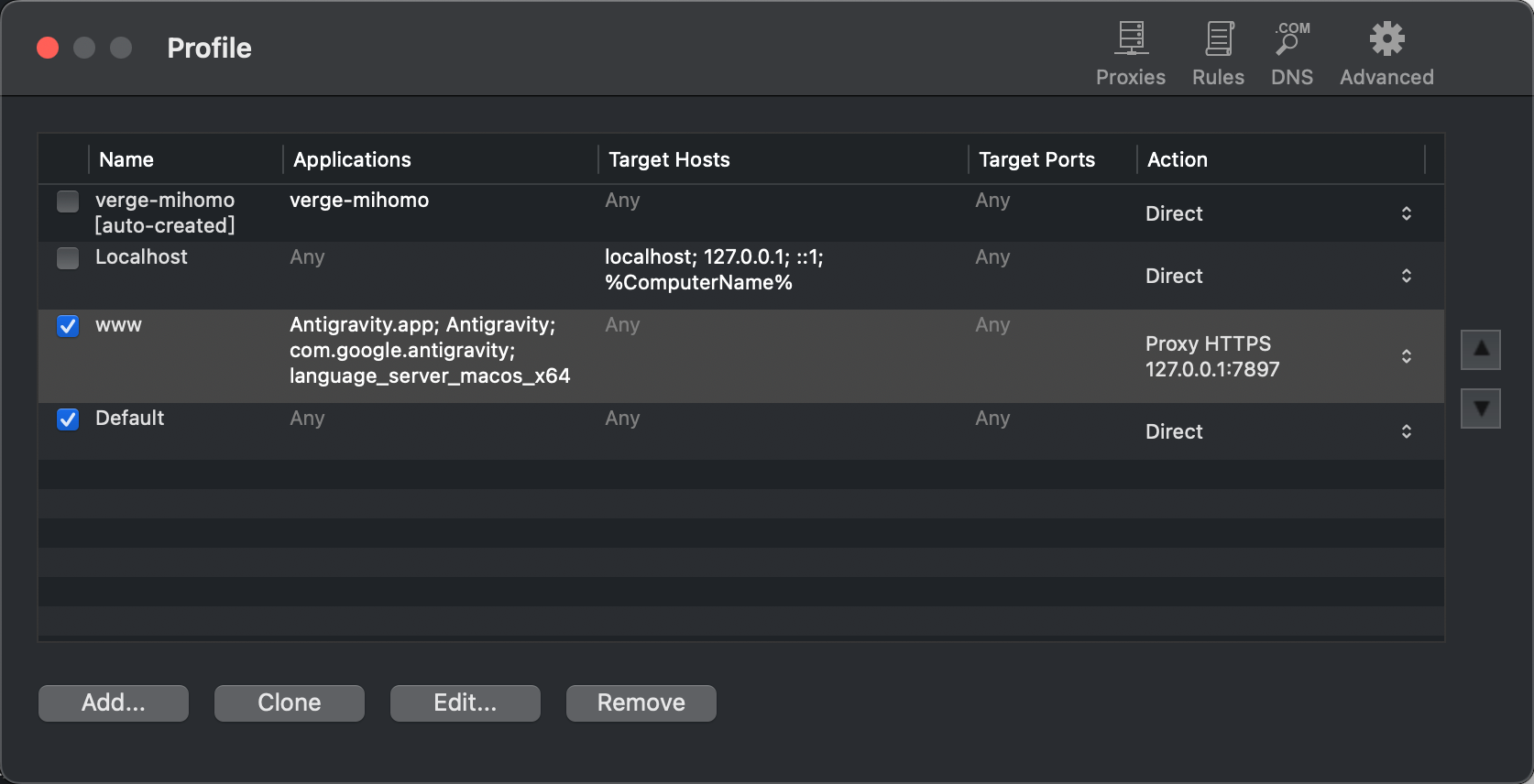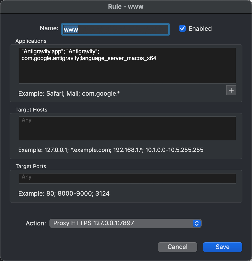 ## 准备软件 1、到谷歌官网下载 反重力的最新版本。然后安装上去。 2、https://github.com/lbjlaq/Antigravity-Manager/releases 下载这个 tools,这个是用来 托管Antigravity 账号用的。 应该不是必须的,但是如果你在Antigravity登陆google账号的时候,不行的话,可以用这个软件解决。 3、https://www.proxifier.com/ 这是一个流量精准代理的软件,直接在官网下载31天的试用版本,到期如果 破解,自行想办法。 Antigravity Tools 看下图,如何登陆自己的账号。  ## proxifier代理软件说明 重点说一下这个 proxifier。 这个软件的配置直接决定是否能把agent给加载出来。 如果没有配置正确的话,Antigravity就算登陆成功了,右侧的对话框会一直 显示: `one moment the agent is currently loading 我参考了: https://yinbingshi.com/blog/antigravity_keep_loading 他这个文章里配置的 language_server_macos_arm 是M芯片的苹果系统。 但是我提intel的苹果笔记本,所以我使用的是:language_server_macos_x64 最终参数如下:    关键点就是这个: "Antigravity.app"; "Antigravity"; com.google.antigravity;language_server_macos_x64 "Antigravity.app"; "Antigravity"; com.google.antigravity; 这个是我点右下角的加号选择出来自动带上的,,最后的language_server_macos_x64 是我手动加上的,如果你是m芯片的苹果, 改成 language_server_macos_arm ## 如果我是Windows? 参考:https://mbd.baidu.com/newspage/data/dtlandingsuper?nid=dt_5044189462327787577&sourceFrom=search_a 如果是win10 win11的话,,配置成:antigravity.exe; claude.exe; language_server_windows_x64.exe;inno_updater.exe  ## 账号的购买 Antigravity账号的话可以到 闲鱼上买,29块钱一年。 卖家会给你发 账号 - 密码 - 加密串 最后的这个加密串是google身份验证器用的。 可以到下面这个网址 用加密串 换取一个6位的数字,在登陆的时候会有这个验证。 https://2fa.chat/ 谷歌身份验证器